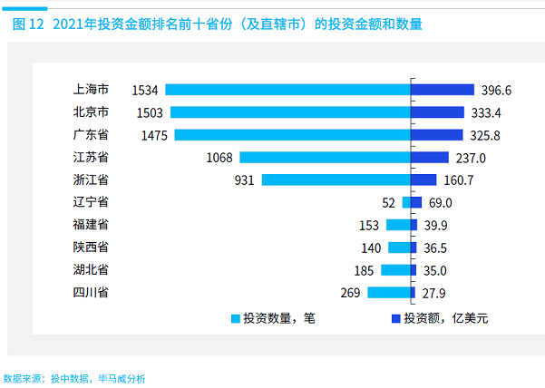 從地區分佈來看,上海市在投資規模和數量上均領先全國。2021年上海市投資規模和數量分別為397億美元和1,534筆;北京市規模和數量分別為333億美元和1,503筆,位居第二。廣東、江蘇、浙江分列第三至第五位(圖12)。前五個省和直轄市投資總額的全國占比達87%,地域集中度較高。