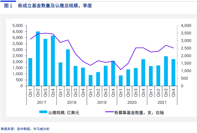 2020年下半年隨著防疫常態化,市場流動性提升,資本的信心得到修復,募資市場開始回暖。2021年VC/PE市場新成立基金共9,748只,同比增長28%。基金總認繳規模為8,025億美元,同比增長35%(圖1)。