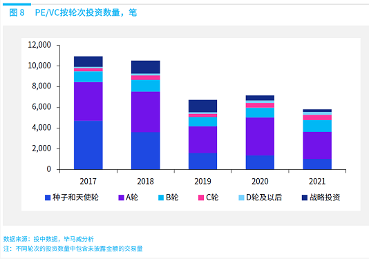 從不同輪次的投資數量來看,以種子和天使輪為代表的早期投資以及A輪、戰略投資下降趨勢明顯,同比下降24%-46%不等。同時,B輪、C輪及D輪及以後等中晚期投資交易數量上升明顯,同比增長均在10%以上(圖8)。