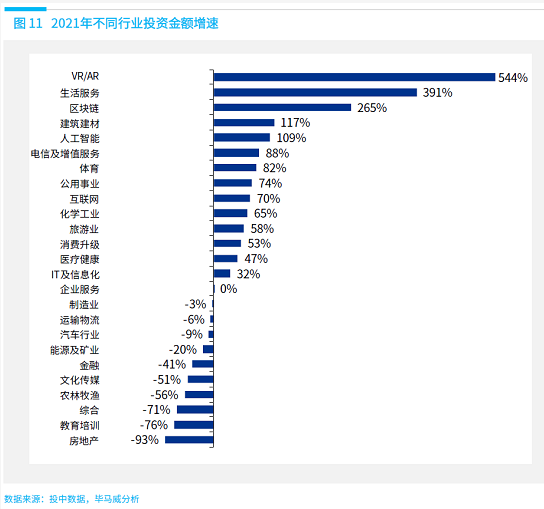 從投資增速來看,VR/AR行業同比增長544%,位列第一。其次生活服務、區塊鏈、建築建材、人工智慧、電信及增值服務、體育、公用事業、互聯網和化學工業等行業也都實現了較快增長。這些賽道投資快速增長,一方面和部分行業基數較低,容易實現同比增速大幅上漲有關,另一方面也得益於其良好的發展前景以及政策的支持。在去年房地產調控收緊和教培行業 “雙減”政策的影響下,這兩個行業的投資趨冷,同比下降93%和76%。