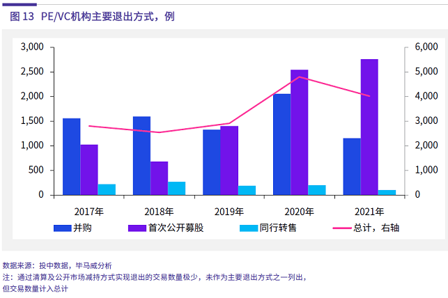 IPO已成為PE/VC機構實現退出的主要方式。通過IPO實現退出的交易數量由2020年的2,540例增至2021年的2,756例,增長9%。與此同時, 2021年機構通過並購實現退出的數量較2020年大幅降低,降幅達44%(圖13)。