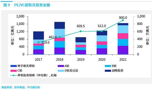 2021年VC/PE市場投資整體企穩,總投資規模為1,992億美元,較2020年同比增長10%,雖然與2018年3,184億美元的總投資額仍有一定差距,但顯示後疫情時代投資者的信心已逐漸改善。從投資數量來看,2021年總投資數量為8,773筆(包括未披露金額的專案量),與2020年投資量基本持平,小幅上升2%(圖7)。2021年單筆交易規模(中位數)900萬美元,同比上升47%(圖9),資金進一步向成熟期的專案積聚,顯示出投資機構風格趨於謹慎。