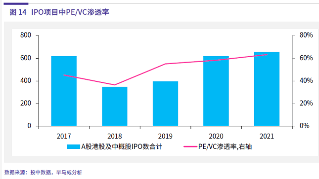 2021年,中國企業在A股,港股及海外市場IPO數量達656例,其中414家上市公司有VC/PE機構背景,IPO PE/VC機構滲透率達63%,處於五年峰值。