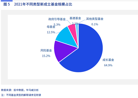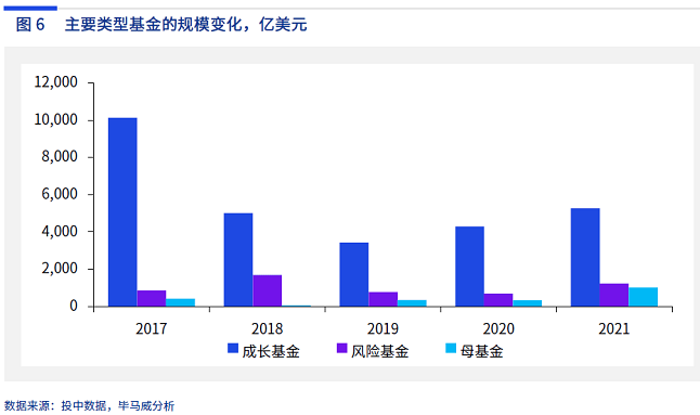 從基金類型來看,2021年新成立的基金以成長型、風險型和母基金等三類為主導,從規模來看,分別占比65%、15%和13%(圖5)。其中母基金增長尤為迅速,2021年新成立母基金總規模達到1,017億美元,為2020年規模的兩倍以上,創近五年新高(圖6)。母基金規模的快速增長得益於國家對戰略性高精尖行業和“專精特新”企業的扶持,各級政府通過設立政府引導基金和大型產業母基金,引導社會資本更好地支持重點行業和企業,推動中國創新引領發展。
