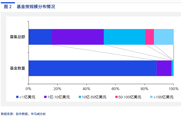 募資市場結構進一步呈現向頭部聚集的趨勢。1億美金以下的新成立基金數量占比近90%,但資金總額占比則只有16%,同比下降6%;而50億美金以上的基金數量占比僅0.2%,但金額占比達20%左右,同比上升11%(圖2)。