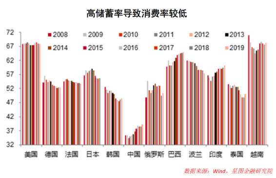 更重要的是,當前國內完全存在通過降低儲蓄率來間接提升消費的客觀條件。長期以來,我國都有勤儉節約、省吃儉用用以儲蓄的傳統。國內儲蓄率從1999開始持續高速增長,最高在2009年達到51%。隨後在房地產快速發展的背景下,儲蓄率有所下降,但近幾年又開始逐漸抬升,已經達到45%的儲蓄率,顯著的高於其他國家。高儲蓄率帶來的是較低的消費率。無論是與發達國家相比,還是與我國發展水準或文化相似的俄羅斯、日本、越南等國家,國內的消費率都大幅度地低於這些國家。因此,當前降低儲蓄率,鼓勵居民消費,存在客觀條件。