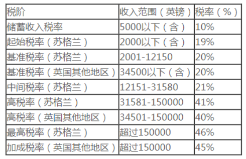 一般情況下,英國稅收居民的個人所得稅稅率如下: