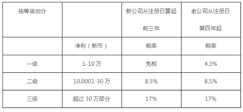 新加坡對企業所得稅有許多減免與激勵措施,其中包括對前三年少於1000萬新幣收入的小型企業免征所得稅。