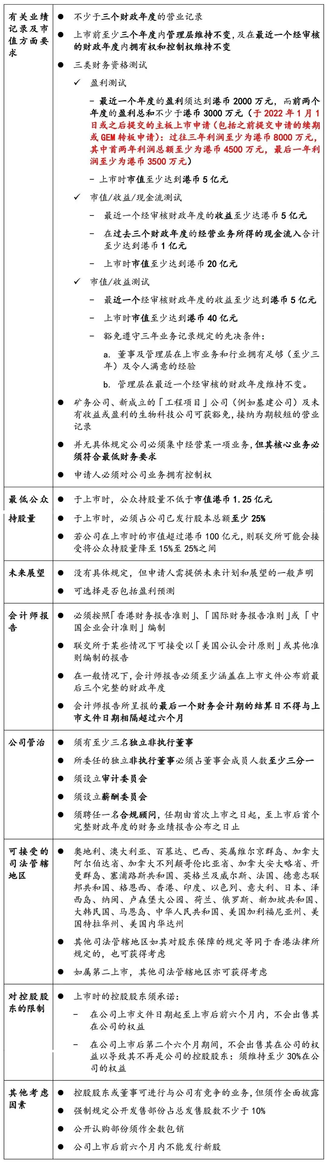 根據聯交所兩個不同的市場以及針對不同的擬上市主體,總結香港上市的主要要求如下: