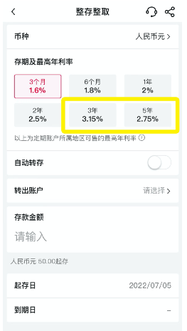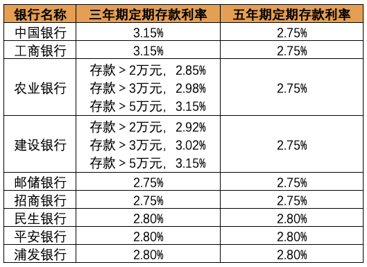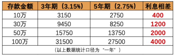 如果按照中行的利率去計算,3年期存款利率為3.15%,5年期存款利率卻只有2.75%,二者利率相差0.4%,