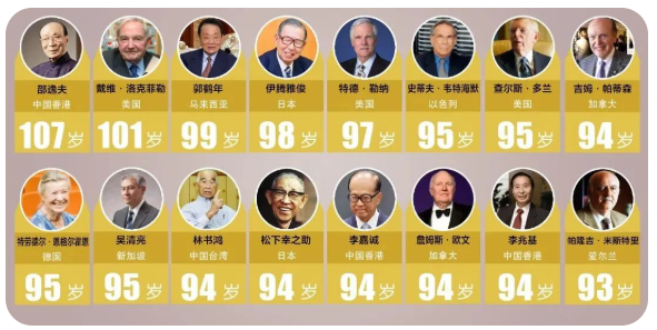 还有虽高寿仍奋斗在经营一线的企业家,如美国地产商特德·勒纳,今年97岁;英特尔创始人摩尔,今年93岁,虽然退居二线,但还活跃在慈善与艺术品收藏的一线;伯克希尔·哈撒韦集团现任首席执行官,92岁的巴菲特,与他97岁的搭档查理·芒格,今年在股东大会上连续“神侃”了6个小时,也没显出疲态。伊斯卡刀具创始人,以色列人史蒂夫·韦特海默95岁了。日本经营之神稻盛和夫今年90岁,还在全世界布道。日本的伊藤洋华堂集团创始人伊腾雅俊今年98岁高龄,还有,全球最大的化工企业德国的巴斯夫股份创始人特劳德尔,今年95岁了。