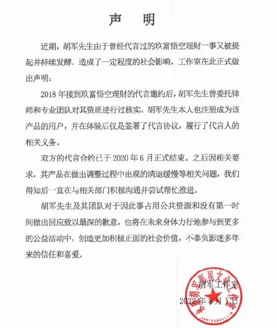胡軍於2018年代言了悟空理財,並擔任首席體驗官。這其實不是一個好時機,2018年互聯網金融平臺經歷過“爆雷潮”,大批平臺出現問題,而胡軍正是在爆雷潮之後代言的悟空理財。按理說,前車之鑒那麼多,胡軍作為代言人應當要對所代言的金融產品可能出現的問題做個瞭解,在選擇代言時更加謹慎才對,畢竟名人效應確實會對受眾的選擇產生影響,這也是部分群眾詬病甚至批判他只認錢卻不負責任的原因。