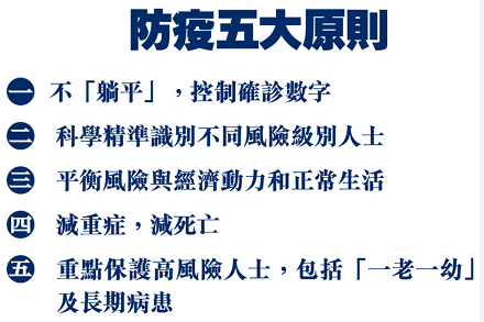 李家超指出,現屆特區政府每次調整防疫政策時都是基於五大原則(見表),今次調整入境檢疫措施亦體現這五大原則。