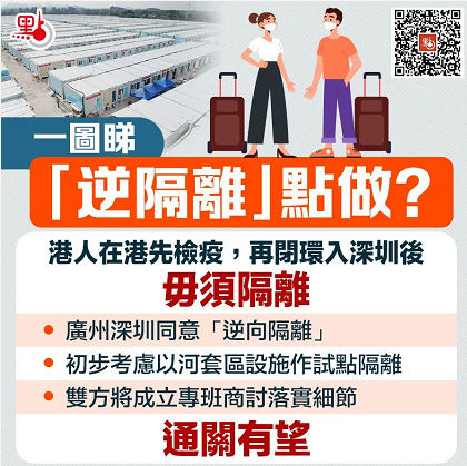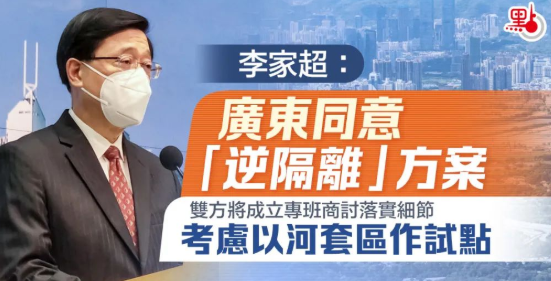 行政長官李家超昨日(9月1日)與廣東省、廣州市及深圳市領導舉行線上會議。李家超下午見記者時表示,在會議上提出「逆向隔離」的方案,即香港赴內地人員先在香港隔離,再以死循环方式前往內地,以符合內地「7+3」入境檢疫政策。粵方及深方對該項建議表示支持,將成立專班落實推進。李家超表示,初步考慮以河套區設施作逆隔離試點。 今次是李家超以行政長官身份首次與廣東領導舉行會議,他感謝廣東省、廣州市、深圳市對香港特區的支持,特別是在第五波疫情期間幫助香港管控疫情,派出檢測及醫護人員支持香港,及保障香港物資供應。 李家超說,今次會議內容很充實,達到多項成果,包括: 第一,在粵港合作機制方面,雙方同意強化設立13個粵港合作專班,涵蓋防疫通關、北部都會區、南沙方案、科創、金融、商貿、青年就業等多個範疇。港方專班將由司局長負責牽頭,李家超相信合作架構及機制將促使雙方推進各項合作專案,達至廣泛成果,雙方將會儘快展開工作。北部都會區專班將會專門商討北部都會區的溝通、協調事宜,加強兩地合作及交流。 第二,港方提出「逆向隔離」建議,香港赴內地人員將在香港進行隔離,再以死循环方式進入深圳,以符合內地「7+3」的隔離規定。粵方及深方對該項建議表示支持,將成立專班商議細節予以落實。港方專班將由政務司司長帶領。 第三,進一步加強穗港合作,共同推動南沙發展,香港全力支持南沙成為粵港澳大灣區高水準對外開放門戶,為香港自身及行業開拓發展空間。 第四,深港合作方面,雙方梳理現有基礎後,重整架構成立19個專班,涵蓋科技創新、金融、商貿、青年就業創業、前海等。專班由司局長帶領,儘快展開對接。 第五,前海發展方面,香港支持前海繼續發揮「先行先試」的功能,推出更多具體政策,特區政府會積極促進兩地聯同。 第六,推進金融開放創新方面,香港同前海管理局將於近期聯合發佈十八條新措施,便利香港創投及私募基金的跨境業務發展。 「逆隔離」點做?港人在港先檢疫,入境內地毋須隔離