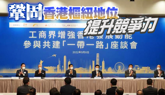 由香港貿發局和香港七大商會共同主辦的 「工商界增強香港發展動能 參與共建『一帶一路』座談會」,8日在香港會議展覽中心舉行。港資、外資、中資企業和商會組織120多名負責人參會,這是今年7月1日習近平主席視察香港並發表重要講話以來,香港工商企業舉辦的最大規模的響應交流活動。與會企業代表暢談機遇、分享體會,提出了一系列大力增強香港發展動能、積極參與國家戰略的務實舉措,展現了對香港發展前景的堅定信心。香港特區行政長官李家超、香港中聯辦主任駱惠寧應邀出席並致辭。