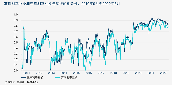 與離岸人民幣利率互換相比,內地市場的人民幣利率互換與基準利率走勢的相關性往往更高。我們分別統計了在岸市場的人民幣利率互換和離岸人民幣利率互換與2017年以來中國五年期國債彭博指數的60天滾動相關係數,發現在岸利率互換與該基準的相關性始終高於離岸利率互換。而且,在岸利率互換在同時期內的波動性也更低。