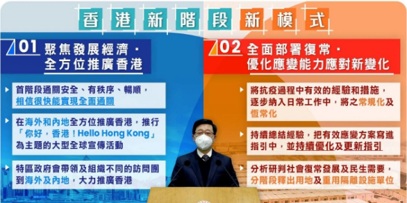 另外,李家超今日在社交平台發文表示,隨着周一(1月30日)正式撤銷「隔離令」措施,特區政府對新冠疫情的管理邁向新階段、新模式,逐步建立新常態系統。目前,政府兩大工作目標是聚焦發展經濟,向海外及內地全方位推廣香港,以及全面部署復常,把已優化和有效的應對方案常規化,並持續按實際情況優化應變能力,以應對新變化、新威脅。