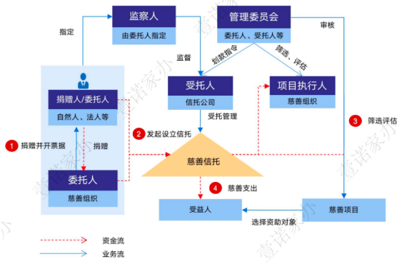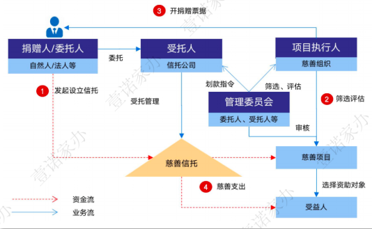 在這種模式下,自然人或企業等作為委託人,信託公司作為受託人,負責慈善信託的設立、信託財產的保值增值與日常運營管理。決策及專案執行方面,實務中,可能會有三種情況: