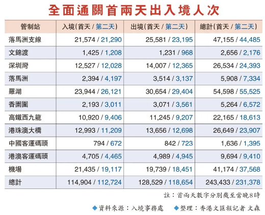 香港特區署理行政長官陳國基7日出席行政會議前會見傳媒時表示,香港與內地自2月6日起已全面恢復通關,整體運作良好,旅客過關有序、順暢,當天總出入境人次約28萬,出入境約各占一半。