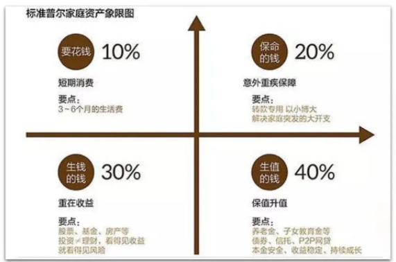 無論你去哪家銀行、基金、券商、保險、信託等公司,懷揣著一筆幾千到幾億的現金類資產,接待你的銷售人員(你帶的數字多少,或者說銷售人員評估你的投資額多少,形成了你被對接的規格),基本都會給你講下麵這張圖——標準普爾資產配置圖。
