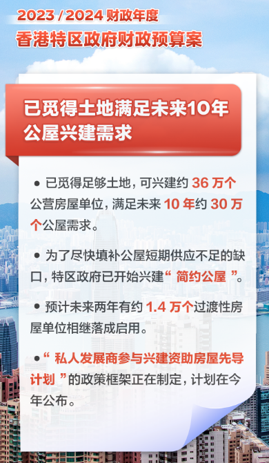 陳茂波說,特區政府已覓得足夠土地,可興建約36萬個公營房屋單位,可以滿足未來10年約30萬個公屋需求。