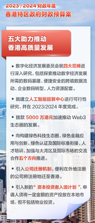 陳茂波指出,財政預算案將從五個方向發力推動香港經濟高質量發展,包括數字經濟、Web3(第三代互聯網)、國際綠色科技及金融中心、引進企業、彙聚人才。