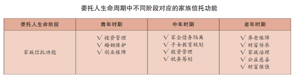 從滿足委託人生命週期裏不同階段的需求看,家族信託主要具有以下功能: