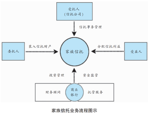 家族信託作為一種信託產品,其核心價值是為了實現家族財富的管理、保護和傳承,業務流程主要涉及委託人、受託人和受益人三方主體之間的關係(如圖所示)。
