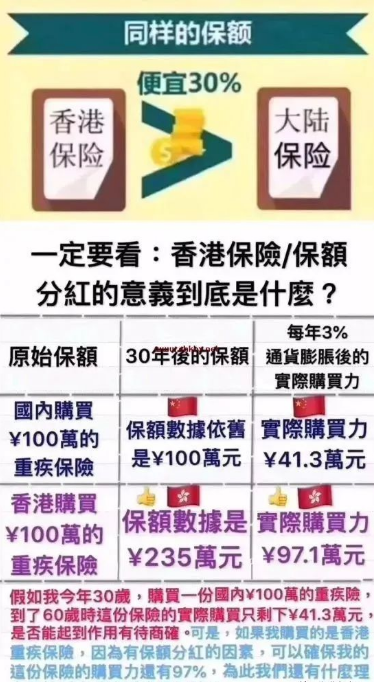 隨著醫療技術的發展,通貨膨脹的影響,國內現在的重疾險已定無法解決客戶未來生病住院的治療花費需求,香港保險獨有的特色,重疾險首十年保額贈送35%-100%且保額終身有分紅。確診即理賠,無補充條款約束。