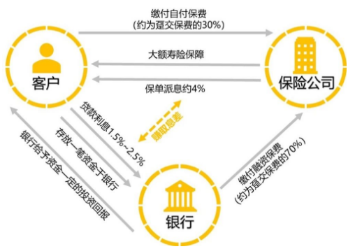 一種是杠杆型終身壽險,例如買1000萬保額,躉交,保費200萬,保障終身,被保人任何時候身故都會獲賠1000萬。當200萬交進保險公司,這份終身壽險也有150萬的現金價值,銀行則可以貸現金價值的90%給客戶,也就是135萬。客戶買這份保單自己掏的錢就只有65萬,加上每年給銀行付的利息。由於銀行的貸款利息通常較低,低於保單現金價值的增長,即使多年後被保人仍然生存,付出了一定利息,但保單的現金價值也在漲,退保的錢也比付出的錢多;而如若被保人身故得早,則用更低的保費獲得了高額賠償。此類保單成為高淨值人群資產傳承的重要工具。