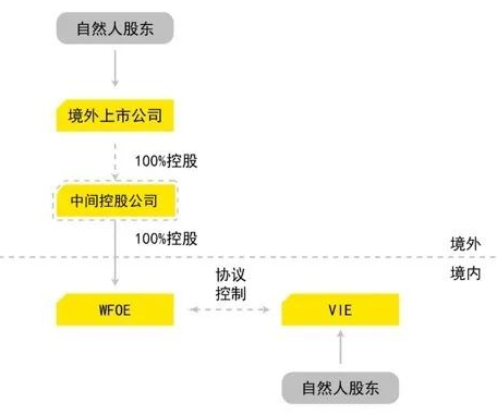 通過上圖,我們可以看出典型的VIE架構包括境外上市主體、中間控股公司、境內WFOE和境內運營實體(即VIE)。