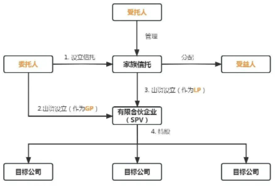 該模式下,委託人設立信託,信託公司作為受託人擔任有限合夥人(LP),委託人擔任普通合夥人(GP),設立有限合夥企業,再由有限合夥企業作為SPV持有目標公司股權。