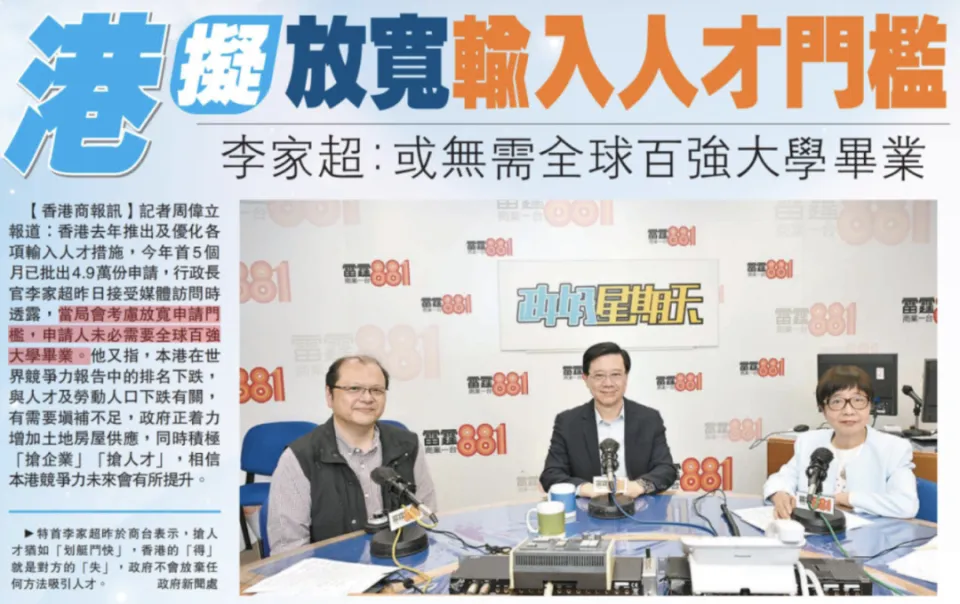 香港特首李家超就公開喊話要在“高端人才通行證”計劃準備進一步放寬申請門檻:
