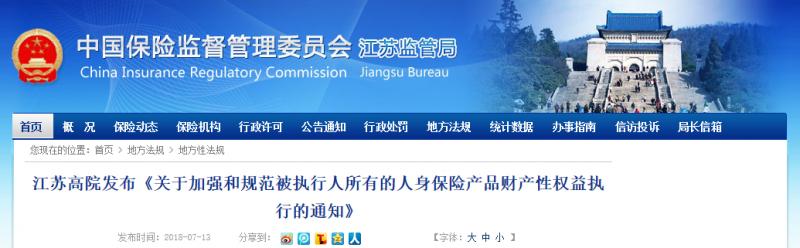 7 月 13 日,江蘇省高級人民法院發佈了《關於加強和規範被執行人所有的人身保險產品財產性權益執行的通知》(後臺回復“避債”,可下載)。同日,江蘇保監局在官網轉載了全文,如下所示: