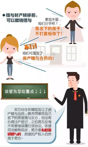 《婚姻法司法解釋(三)》第六條規定:婚前或者婚姻關係存續期間,當事人約定將一方所有的房產贈與另一方。贈與方在贈與房產變更登記之前撤銷贈與,另一方請求判令繼續履行的,人民法院可以按照合同法第一百八十六條的規定處理。