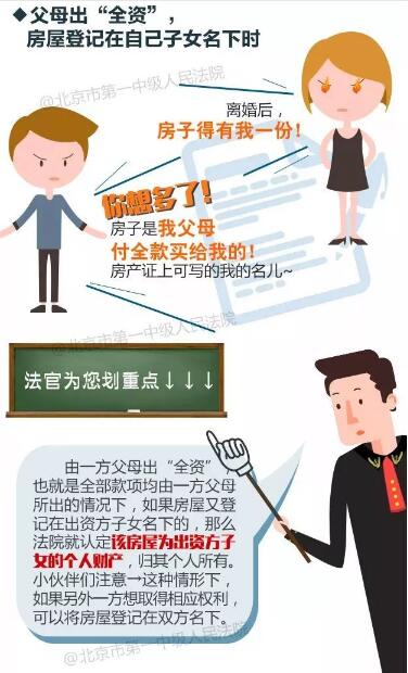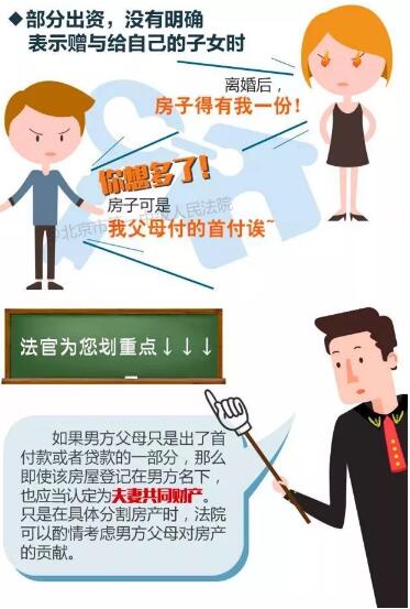 《婚姻法司法解釋(三)》第七條規定:婚後由一方父母出資為子女購買的不動產,產權登記在出資人子女名下的,可按照婚姻法第十八條第(三)項的規定,視為只對自己子女一方的贈與,該不動產應認定為夫妻一方的個人財產。