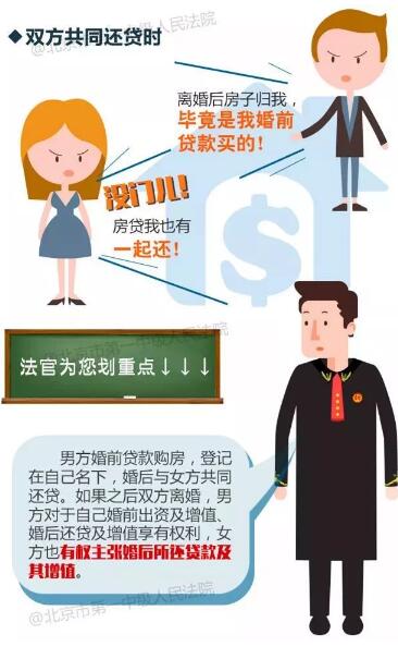 《婚姻法司法解釋(三)》第十條規定:夫妻一方婚前簽訂不動產買賣合同,以個人財產支付首付款並在銀行貸款,婚後用夫妻共同財產還貸,不動產登記於首付款支付方名下的,離婚時該不動產由雙方協議處理。依前款規定不能達成協議的,人民法院可以判決該不動產歸產權登記一方,尚未歸還的貸款為產權登記一方的個人債務。雙方婚後共同還貸支付的款項及其相對應財產增值部分,離婚時應根據婚姻法第三十九條第一款規定的原則,由產權登記一方對另一方進行補償。