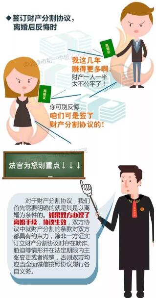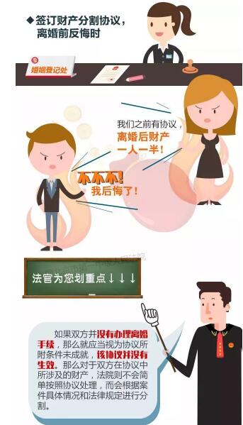 《婚姻法司法解釋(三)》第十四條規定:當事人達成的以登記離婚或者到人民法院協議離婚為條件的財產分割協議,如果雙方協議離婚未成,一方在離婚訴訟中反悔的,人民法院應當認定該財產分割協議沒有生效,並根據實際情況依法對夫妻共同財產進行分割。