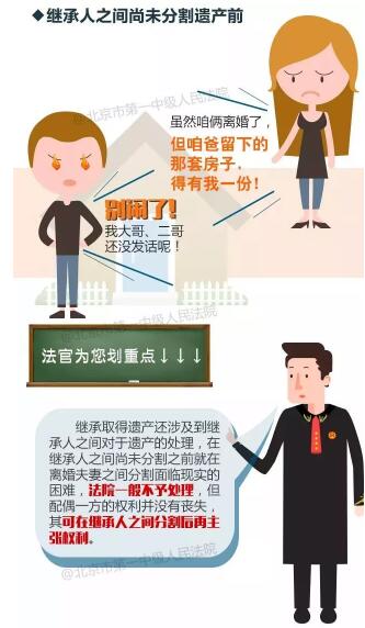 《婚姻法司法解釋(三)》第十五條規定:婚姻關係存續期間,夫妻一方作為繼承人依法可以繼承的遺產,在繼承人之間尚未實際分割,起訴離婚時另一方請求分割的,人民法院應當告知當事人在繼承人之間實際分割遺產後另行起訴。