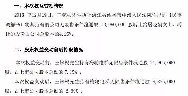 梅輪電梯公告稱,12月19日,因離婚糾紛執行浙江省紹興市中級人民法院的《民事調解書》,王錸根將其持有的公司無限售條件流通股1309萬股(占公司總股本的4.26%)轉讓給屠曉娟。股份減持前,王錸根持有梅輪電梯2196.5萬股股份,占公司總股本的7.15%;股份減持後,王錸根持有公司股份下降至887.5萬股,占公司總股本的2.89%。