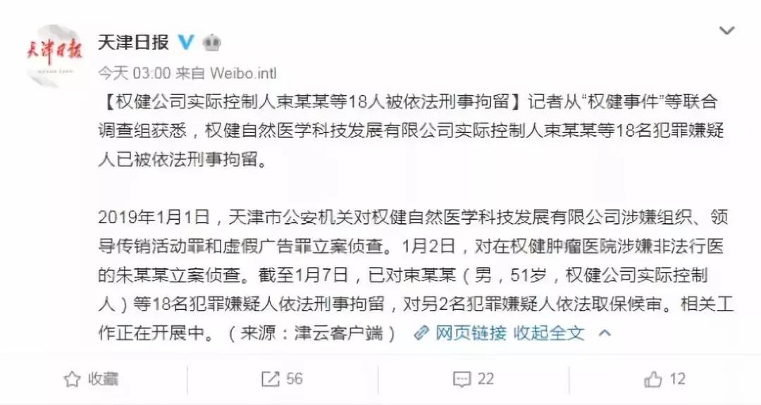 2019年1月1日,天津市公安機關對權健自然醫學科技發展有限公司涉嫌組織、領導傳銷活動罪和虛假廣告罪立案偵查。1月2日,對在權健腫瘤醫院涉嫌非法行醫的朱某某立案偵查。截至1月7日,已對束某某(男,51歲,權健公司實際控制人)等18名犯罪嫌疑人依法刑事拘留,對另2名犯罪嫌疑人依法取保候審。相關工作正在開展中。