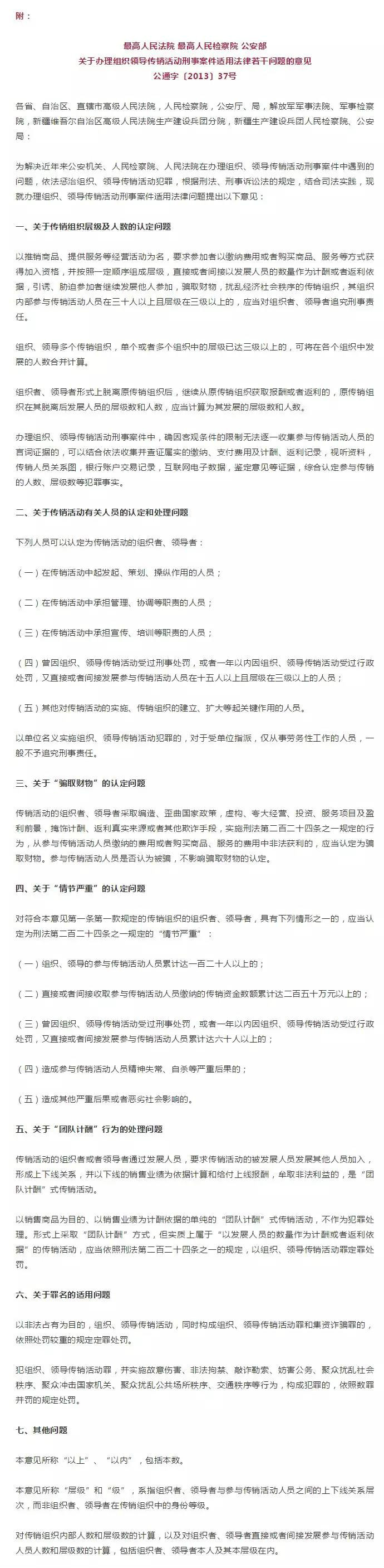 《中華人民共和國刑法》第二百二十四條之一規定:組織、領導以推銷商品、提供服務等經營活動為名,要求參加者以繳納費用或者購買商品、服務等方式獲得加入資格,並按照一定順序組成層級,直接或者間接以發展人員的數量作為計酬或者返利依據,引誘、脅迫參加者繼續發展他人參加,騙取財物,擾亂經濟社會秩序的傳銷活動的,處五年以下有期徒刑或者拘役,並處罰金;情節嚴重的,處五年以上有期徒刑,並處罰金。