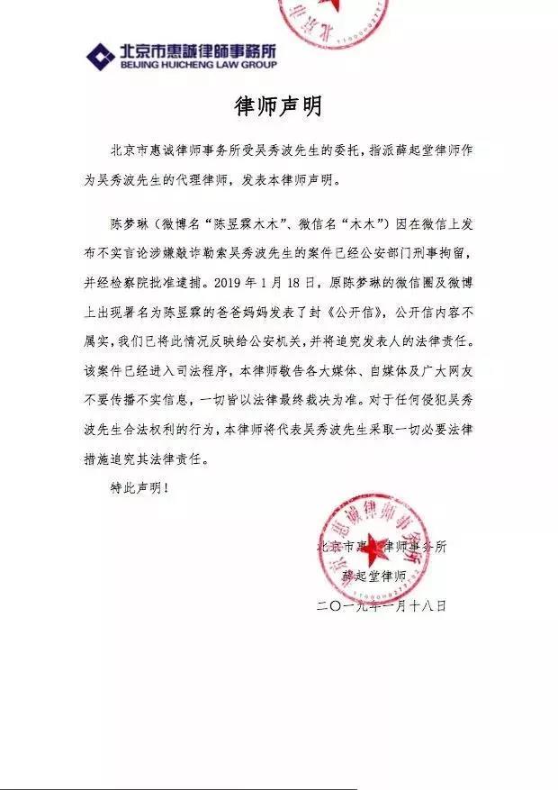 2019年1月18日晚,自曝與吳秀波有7年感情的女演員陳昱霖的父母通過女兒的微博發公開信求助,表示陳昱霖因被吳秀波指控涉嫌敲詐勒索罪,目前已經被關押。