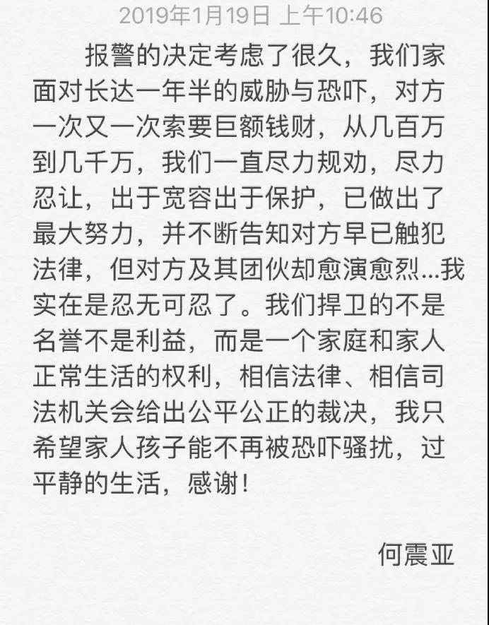 聲明中,何震亞表示自己因為忍受不了長久以來受到第三者的巨額勒索,最終決定報警,讓警方和法律還給自己和家庭一個公正的裁決。