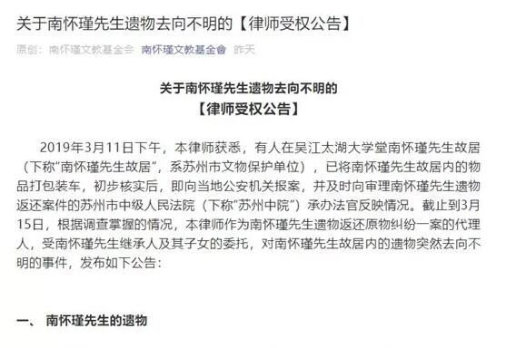 “國學大師”南懷瑾已經逝世7年,但圍繞遺產的糾紛卻仍未平息。3月18日,南懷瑾文教基金會發佈了《關於南懷瑾先生遺物去向不明的律師授權公告》,公告載明,在南懷瑾先生遺物返還訴訟期間,南懷瑾先生故居內的遺物突然去向不明。