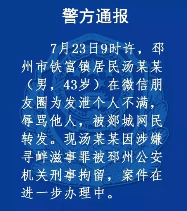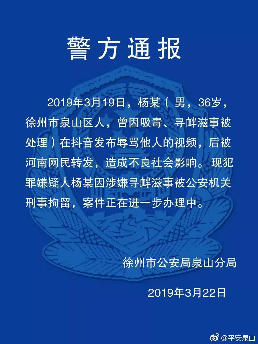 通報顯示:3月19日,楊某(男,36歲,徐州市泉山區人,曾因吸毒、尋釁滋事被處理)在抖音發佈辱罵他人的視頻,後被河南線民轉發,造成不良社會影響。現犯罪嫌疑人楊某因涉嫌尋釁滋事被公安機關刑事拘留,案件正在進一步辦理中。