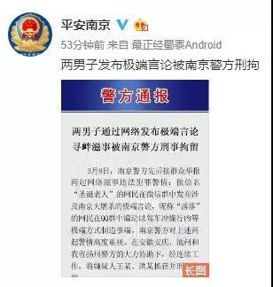 3月19日,江蘇徐州男子楊某在某視頻軟體上發佈辱罵河南人的視頻,被線民轉發後,造成不良社會影響。目前,該男子已被刑拘。
