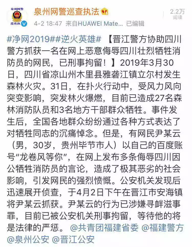 就在剛剛,泉州網警發佈微博:侮辱烈士的男子已在晉江落網,被刑拘!