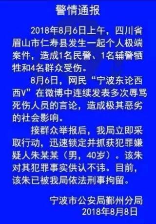 2018年8月6日上午,仁壽縣公安局富加派出所發生一起個人極端案件導致2名員警重傷犧牲。事發後,整個仁壽舉城哀傷,廣大人民群眾哀傷不已。而微信平臺上,一位昵稱“高山流水,川流不息”的線民在名為“和諧中鐵”的微信群內發佈“殺人者是英雄好漢,員警是拿了證的土匪”等辱警言論,其發佈的辱警言論涉及廣泛,造成的影響極其惡劣。該人現已被刑拘。據悉,全國因侮辱四川省犧牲民警和輔警被刑拘的人至少已達8名。