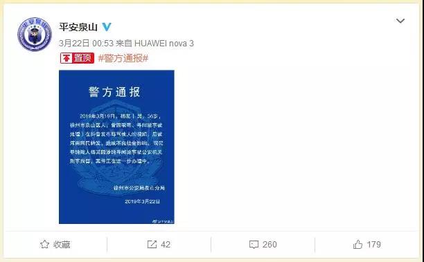 3月22日淩晨,江蘇省徐州市公安局泉山分局官方微博@平安泉山 發佈通報。
